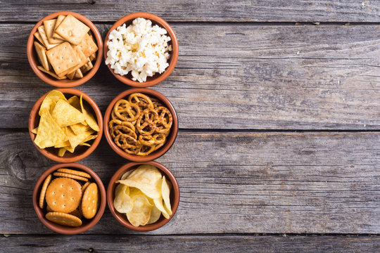 Salty snacks. Pretzels, chips, crackers in wooden bowls.