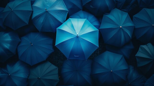Standing Out From The Crowd A Bright Blue Umbrella Open Amongst Many Dark Black Umbrellas In The Night Showcasing Individuality Uniqueness And Boldness In A Sea of Sameness