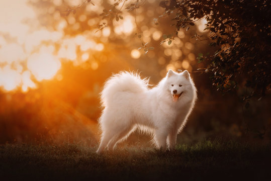 happy samoyed dog posing outdoors at sunset in summer