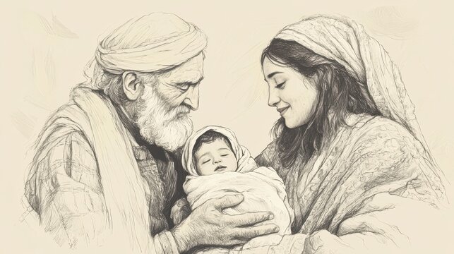 Biblical Illustration of The Birth of Samuel: Elkanah and Hannah Presenting Newborn Samuel to the Lord in Thanksgiving, Beige Background, Faith, Worship, Old Testament Story