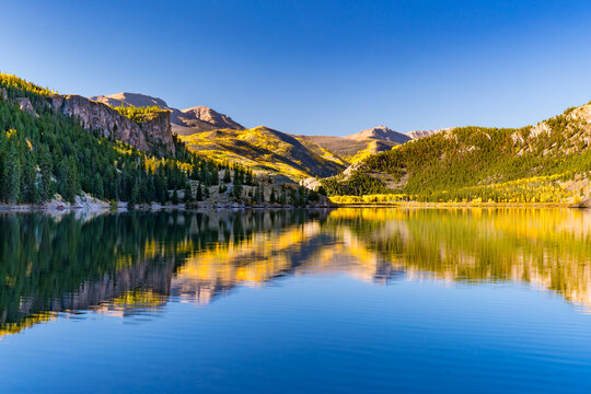 Reflection of aspen trees on Lake San Cristobal in the San Juan Mountains of Colorado