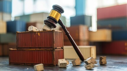 Gavel striking stacked shipping containers, symbolizing trade disputes or legal action.