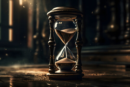 A striking hourglass with golden sand stands solemnly against a dark background, a poetic symbol of the fleeting nature of time.