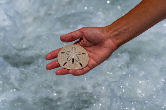Close up top down view of an Eccentric Sand Dollar (Dendraster excentricus), at the edge of the wet sand.