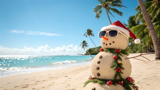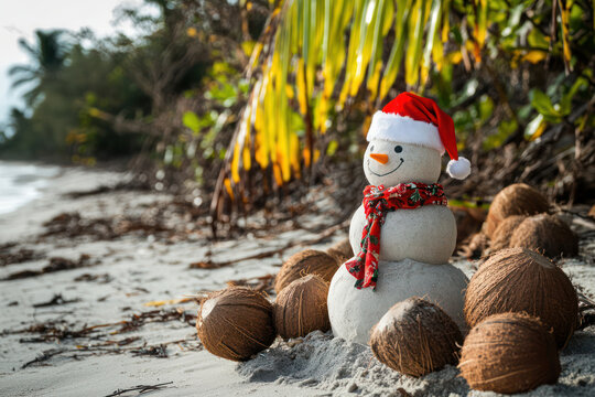Creative a sandman instead of a snowman wearing a Santa hat and scarf on the beach, surrounded by tropical Christmas decorations like coconuts