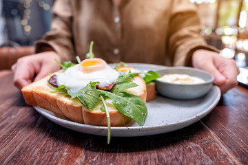 A woman holding a plate of breakfast sandwich with eggs, bacon and sour cream on wooden table