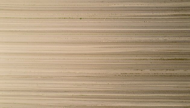 Top down aerial view of parallel vehicle tracks creating an abstract linear pattern on a sandy beach or dirt road