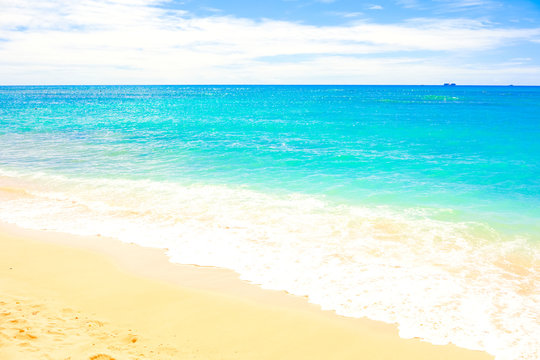 Clear blue  ocean water coming onto sandy beach with seafoam