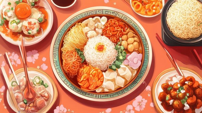 A traditional Asian food illustration featuring yee sang and lou sang dishes for Chinese New Year celebrations, highlighting culinary heritage and festive flavors.