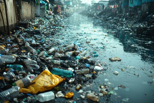 Pollution in Urban Waterway: Trash and Waste Accumulated in Stagnant Water