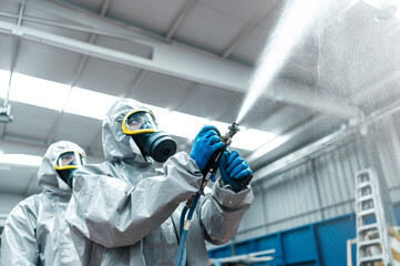 Low angle view of sanitation workers spraying chemical from hose in warehouse