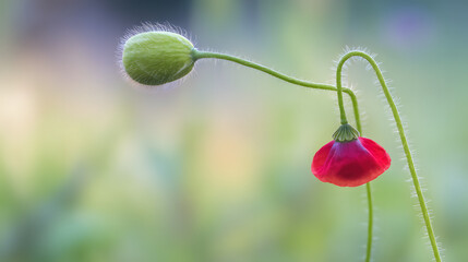 pertinent. A single poppy flower with a prominent green seed pod, swaying gently in soft focus. gardening catalogs, home-decor guides, designed for gardening and botanical catalogs.