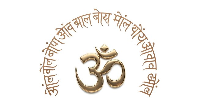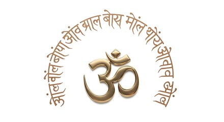 Golden om symbol with sanskrit script on white background