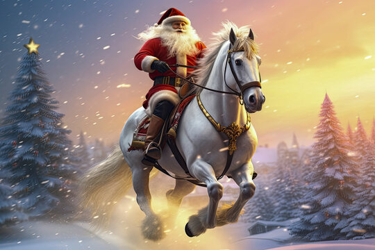 Christmas sleigh illustration of Santa riding in a decorated carriage pulled by a horse with glowing string lights and presents creating a joyful seasonal holiday scene