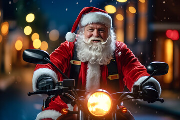 A cute smiling Santa Claus is riding an motorbike to delivering presents. He is dressed in his traditional red and white outfit - ai generative