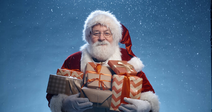 Close up shot of senior bearded man in santa clause outfit carrying gift boxes, isolated on blue background - christmas spirit, holiday mood