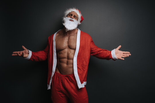 Shirtless muscular man in Santa Claus costume with spread arms in studio. Emotional portrait of handsome male model in Christmas outfit at grey background.