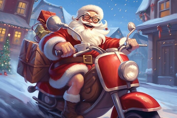 Painting of a cute smiling Santa Claus is riding an scooter to delivering presents. He is dressed in his traditional red and white outfit - ai generative