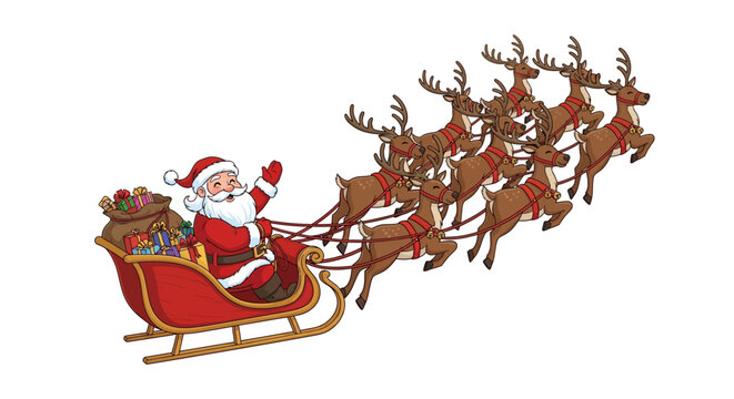 Santa Claus flying in sleigh pulled by reindeer delivering Christmas gifts for holiday joy