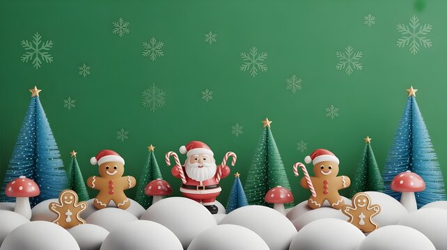 Christmas holiday scene with santa claus, gingerbread cookies, candy canes, and festive trees decorated with snowflakes and mushrooms on a snowy white background
