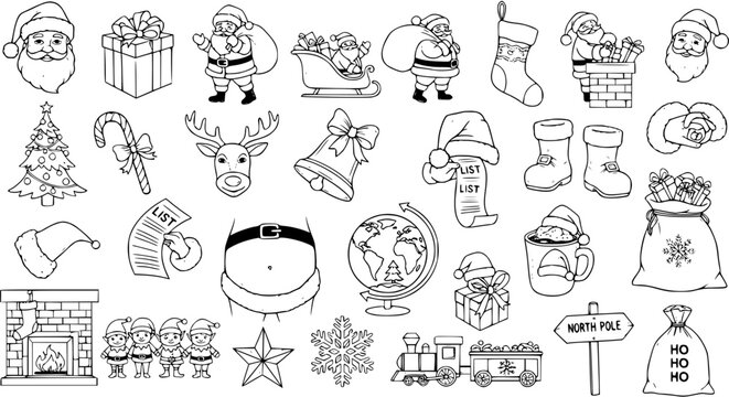 Black and white hand-drawn Christmas themed icons, illustrations, and elements collection including Santa Claus, gifts, reindeer, tree, and more, perfect for holiday designs.