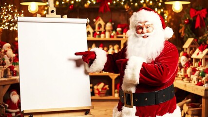 This Santa Claus image shows him in his iconic red and white suit, pointing at a blank sign. Perfect for Christmas ads and promotions, spreading festive cheer during the holiday season