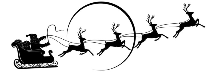 Santa’s sleigh silhouette flying across moonlit sky