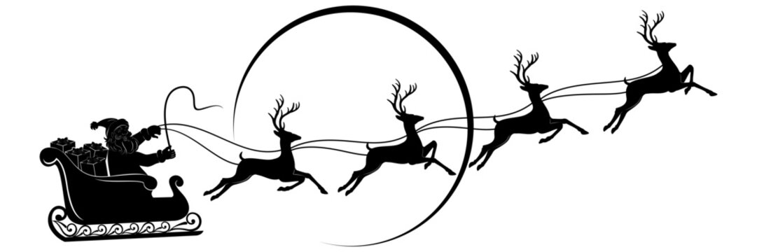 Christmas silhouette of Santa Claus in sleigh pulled by reindeer with stars, snowflakes, and gift sacks, symbolizing festive winter celebration