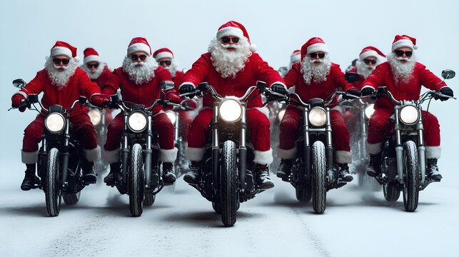 Biker Santas riding motorcycles together in the snow