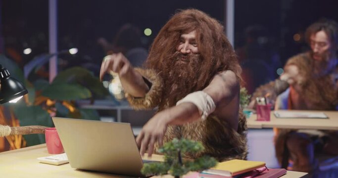 Cave people couple having fun in the corporate modern office. Prehistroci tribal homo sapiens traveling through time.