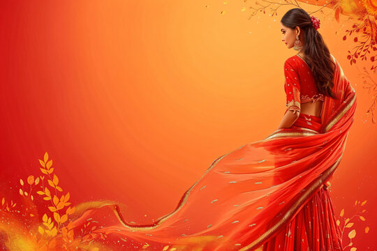 Saree Indian dress in white luxury boutique background. Indian attire in fashion store. Festive outfit. Beautiful Bollywood clothing. Stylish orange party dress. Handloom saree salon. Banner