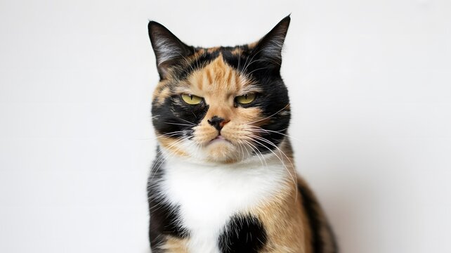 Grumpy calico cat with intense green eyes looking directly forward