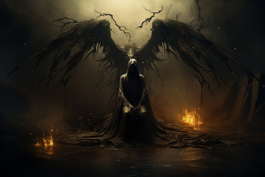 Genrative ai collage picture of evil satanic inferno with dark wings fallen angel in hell