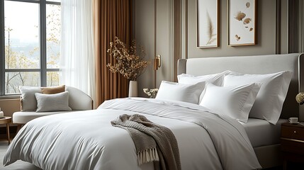 Clean wrinklefree sateen bed sheet in light gray styled in a highend hotel bedroom with decorative cushions and a stylish throw blanket