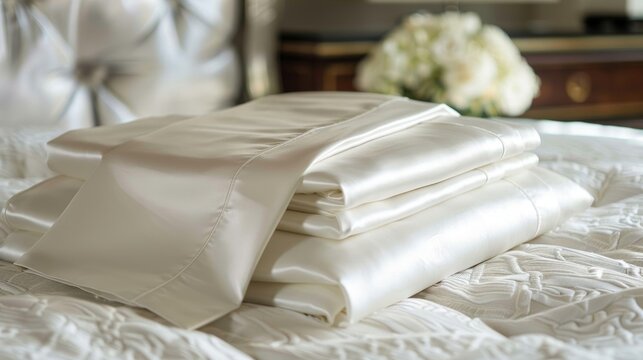 A set of highthread count sateen sheets smooth and supple to the touch promising a restful and luxurious sleep every night.