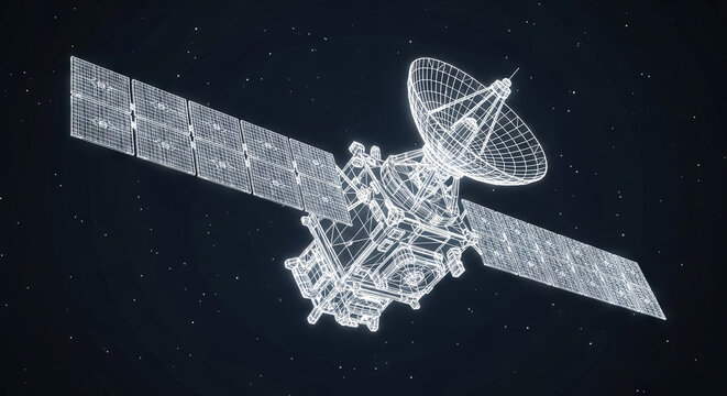 Detailed 3D wireframe satellite in orbit with visible structural and communication elements.