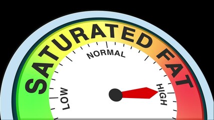 Saturated Fat Level Text or Word Low and Medium to High Meter Concept Animation on Black Background and Blue Screen