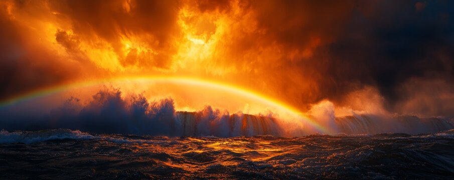Abstract dramatic background in red and yellow colors. Color negative thunderclouds. Dramatic sky background. Panoramic image can be used as a web banner or wide site header.