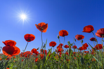 Corn poppies with sun shining brightly in spring at Lake Neusiedl in Burgenland, Austria