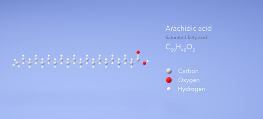 arachidic acid molecule, molecular structures, saturated fatty acid, 3d model, Structural Chemical Formula and Atoms with Color Coding