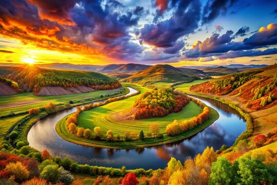 Chromatic Vistas: Panoramic landscapes, saturated colors, sweeping curves, vibrant
