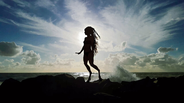 Silhouette of the satyr on the cliff. Dramatic panorama of rough sea with cloudy sky. Fantasy concept, background of god Pan, bright and contrasting colors in painted style.