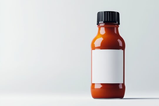Mockup of plain red sauce bottle  bottle with white cap and blank label on wooden table  kitchen background