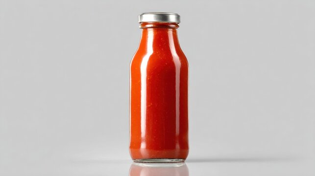 Glass bottle of red hot chili sauce on rustic wooden table. Tasty and spicy. Flavorful food dressing