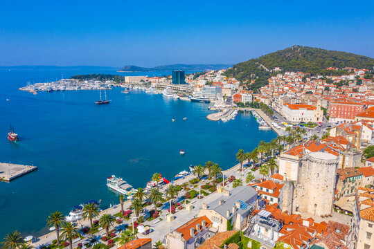 Aerial view of Riva promenade in Split with Marjan hill, Croatia