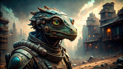 Lizard saurian human with protective clothing in dystopic apocalyptic world