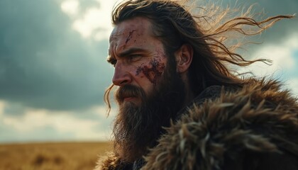 Man with beard and long hair has battle scars on his face. He wears fur clothes and stands in a grassy field with wind blowing. He looks determined.