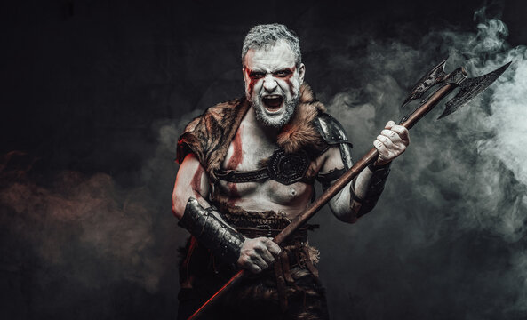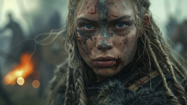 Fierce Viking barbarian viking woman warrior covered in battle mud and war paint, with braided hair and piercing blue eyes after intense medieval combat