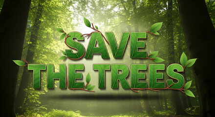 Green text "Save The Trees" overlaid on a lush forest scene, promoting environmental awareness.