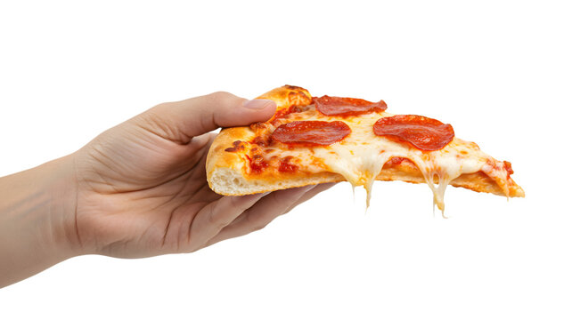 Delicious pepperoni pizza slice with melted cheese and savory toppings on a clean white background